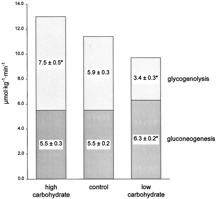To evaluate the effect of dietary carbohydrate content on postabsorptive glucose metabolism, we quantified gluconeogenesis and glycogenolysis after 11 days of high carbohydrate (85% carbohydrate), control (44% carbohydrate), and very low carbohydrate (2% carbohydrate) diets in six healthy men. Diets were eucaloric and provided 15% of energy as protein. Postabsorptive glucose production was measured by infusion of [6,6-2H2]glucose, and fractional gluconeogenesis was measured by ingestion of 2H2O. Postabsorptive glucose production rates were 13.0 ± 0.7, 11.4 ± 0.4, and 9.7 ± 0.4μ mol/kg·min after high carbohydrate, control, and very low carbohydrate diets, respectively (P < 0.001 among the three diets). Gluconeogenesis was about 14% higher after the very low carbohydrate diet (6.3 ± 0.2 μmol/kg·min; P = 0.001) compared to the control diet, but was not different between the high carbohydrate and control diets (5.5± 0.3 vs. 5.5 ± 0.2 μmol/kg·min). The rates of glycogenolysis were 7.5 ± 0.5, 5.9 ± 0.3, and 3.4± 0.3 μmol/kg·min, respectively (P < 0.001 among the three diets).