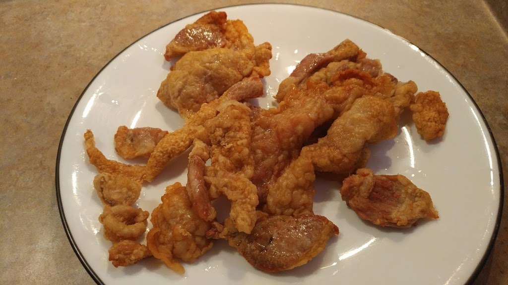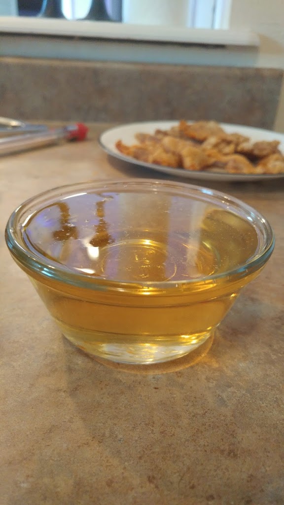 I took off the crispy pork pieces, and left the fat to cool for a while. Then I poured the liquid gold into a small bowl easier to pour from.