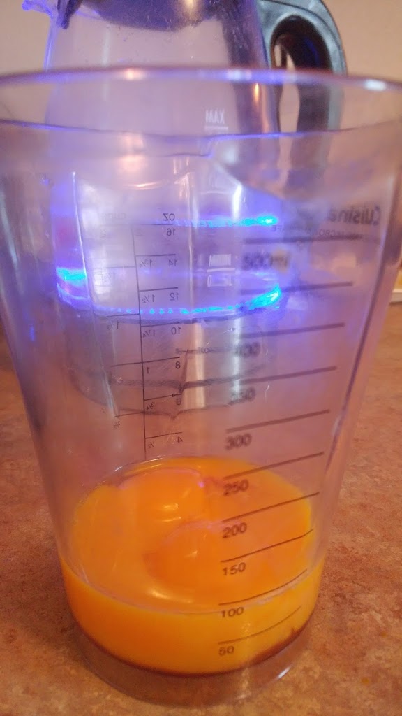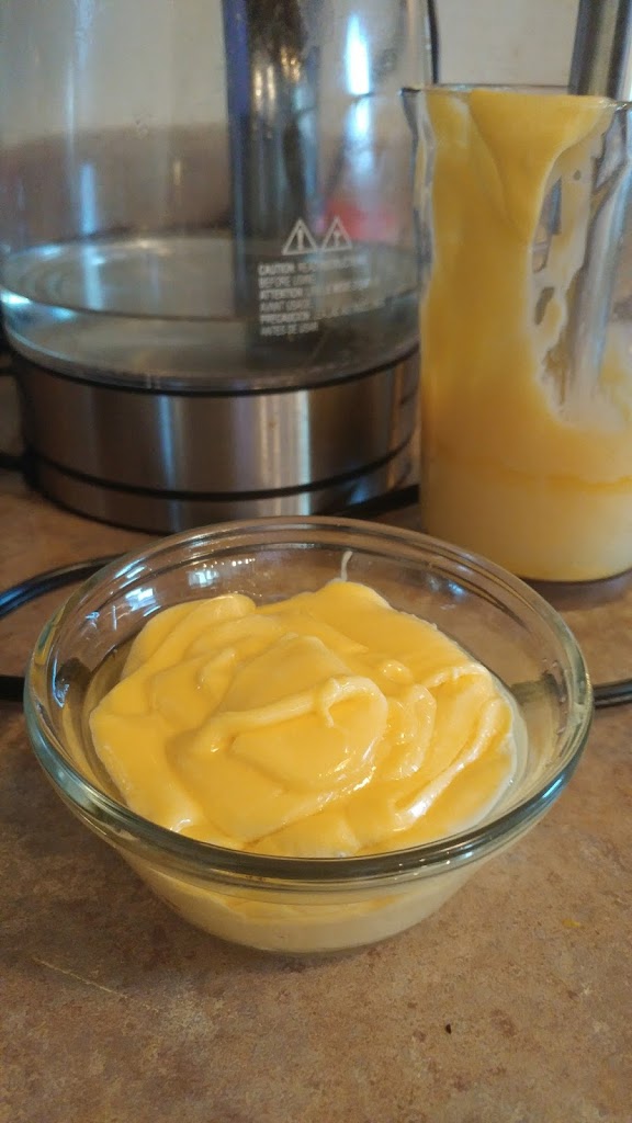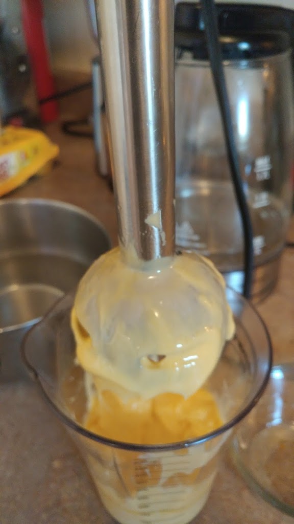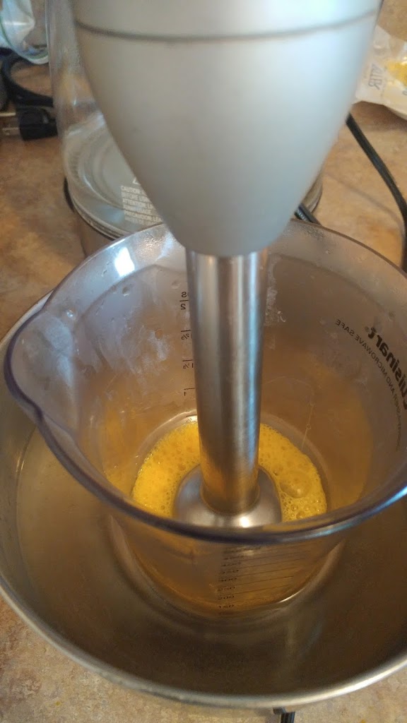 I used an immersion blender to blend four yolks, with the blending cup itself immersed in a bowl of boiled water. Then once they were as thick as they were going to get, I drizzled in all the pork fat, about 6oz.