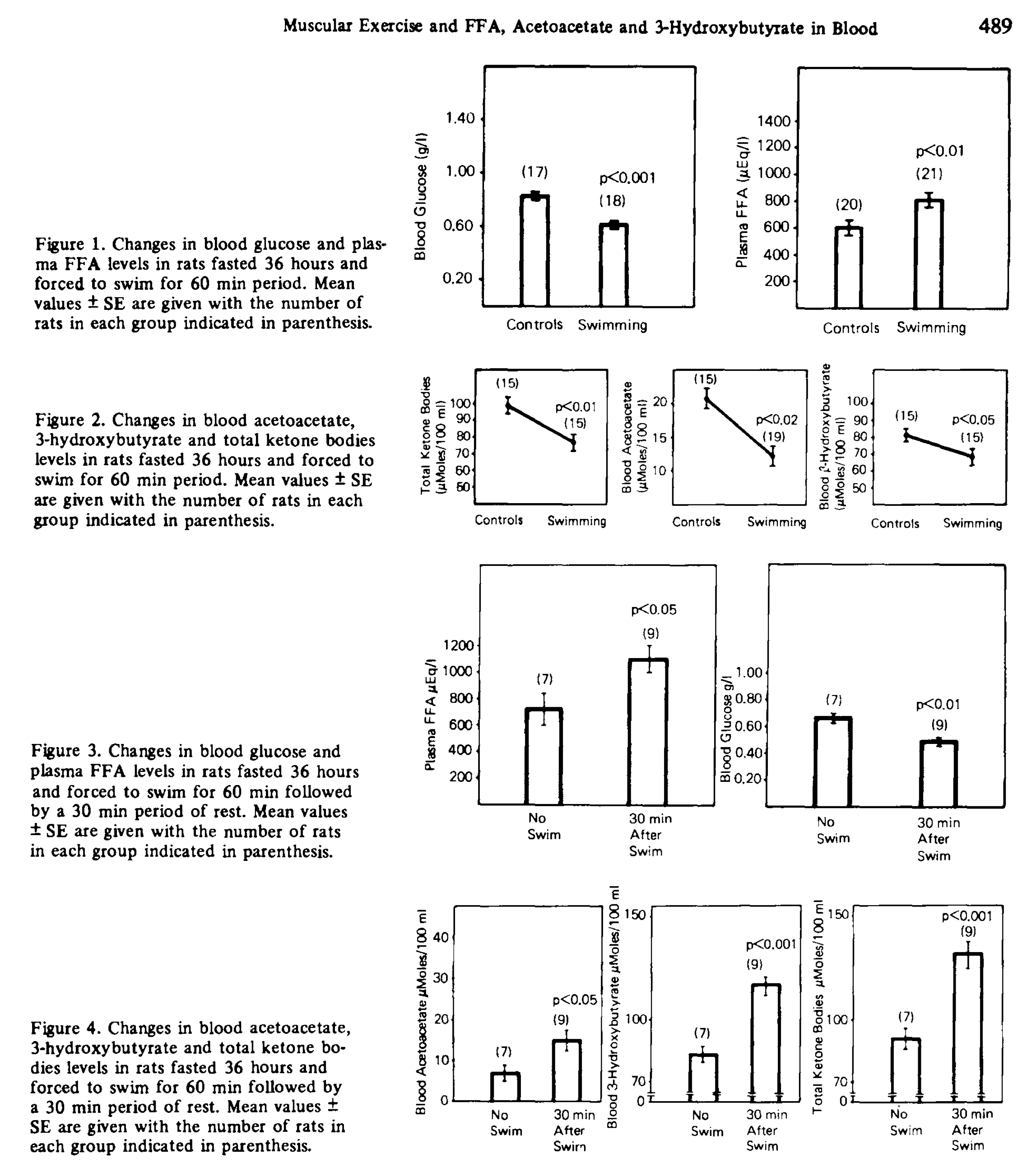 "Endurance-trained animals and human subjects have been reported to exhibit a lesser degree of postexercise ketosis than nontrained controls. We have studied the mechanism of this adaptation. Trained (2 h/day, 6 wk) and nontrained rats were fasted overnight and then run at 16 m/min up a 15% grade for 90 min. Trained rats had lower blood 3-hydroxybutyrate during exercise and during a 90-min postexercise period than nontrained rats. Liver malonyl coenzyme A (CoA), carnitine, and glycogen were not significantly different in the two groups at any time during and after exercise. Therefore these factors cannot be responsible for the difference in ketonemia. Plasma free-fatty acids and hepatic adenosine 3',5'-cyclic monophosphate were elevated in nontrained rats with respect to trained rats. These two differences could conceivably be responsible for a different ketogenic rate. In addition, 3-ketoacid CoA transferase activity of gastrocnemius muscle was increased by training. The increase in ketone oxidizing enzymes of muscle may also be partially responsible for the training-induced attenuation of postexercise ketonemia in these fasted rats."