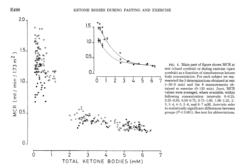 Notably, the concentration at the inflection point appears to fall in the 1-2 mmol range (2-3 for exercise effect), which may have implications for the definition of keto-adapted in the first place. The study is tantalisingly missing data within the 1-2 mmol range!
