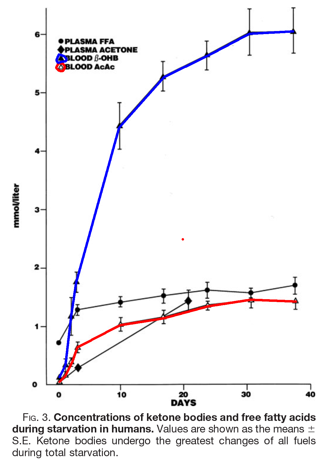 In these studies of fasting and fed ketosis, AcAc tops out just over a mmol. BOHB continues to rise until it reaches just over 4 mmol in therapeutic ketogenesis, or 6 in fasting.