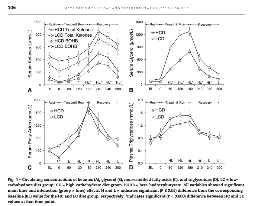 In general, we know that untrained animals tend to have higher post-exercise ketosis than trained ones (see e.g. [Bea1985]). So the fact that the athletes in Volek et al.'s study had rising KBs during exercise and falling after looks like it could simply be an effect of increased MCR from training. It's also of note that the total KBs they had at rest were only about 0.7.